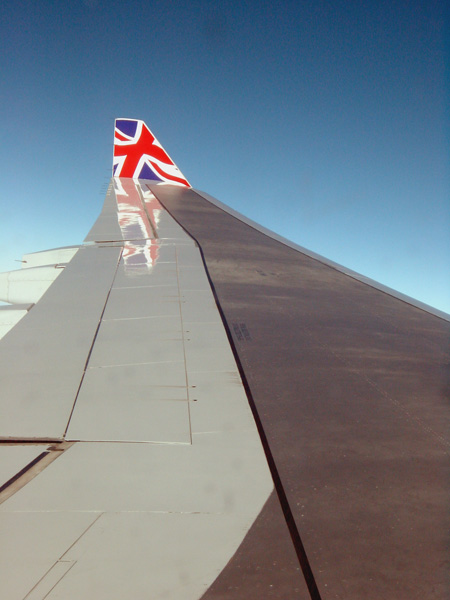 自宅近くのニュージャージー州のニューアーク空港からヴァージンアトランティック航空でロンドン(ヒースロー)に向け出発。座席はちょうど主翼上でした。機体両端のユニオンジャックがかっこいい!