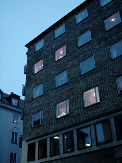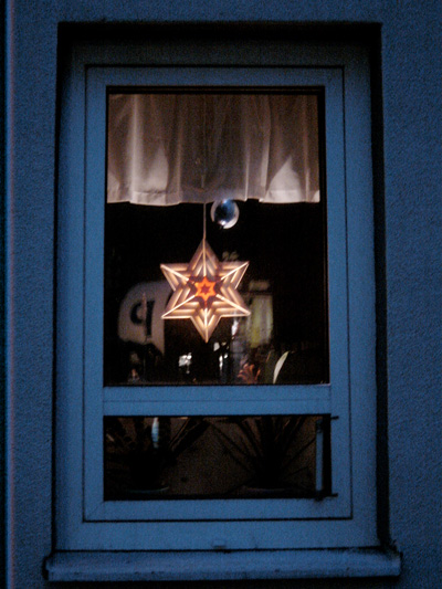 まだ4時ちょっとすぎなのにこの暗さ。でも道沿いの家の窓に飾られた明かりにはいろんなアイディアがあってきれいで見飽きない。