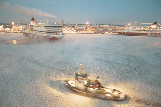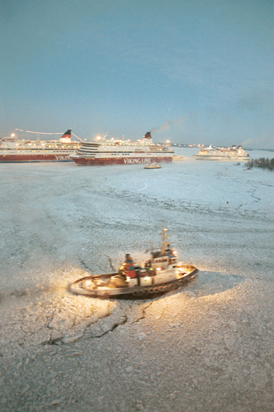 タグボートが見送る中、このようにフェリーが次々と氷をかき分けながら出航。