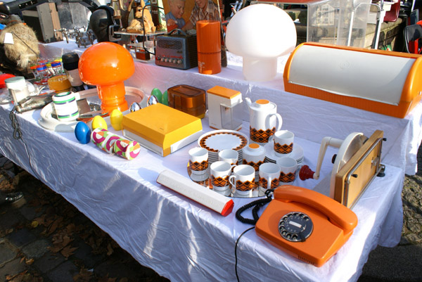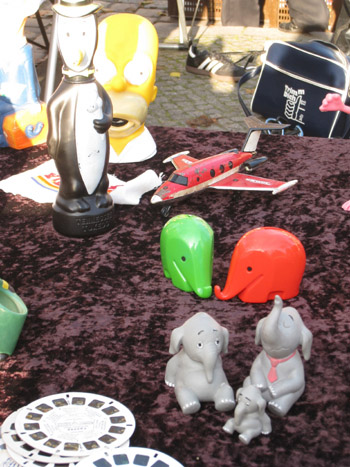 プラスチックおもちゃ中心のお店。右の方にある赤と緑のぞうさんの貯金箱は1970年代にドイツのドレスデン銀行のノベルティーとして作られた貯金箱で、ルイジ・コラーニというデザイナーの作品だそうです(夫談)。 私は手前にいる、所在なさげな表情のぞうさんのほうが気になりましたが。。
