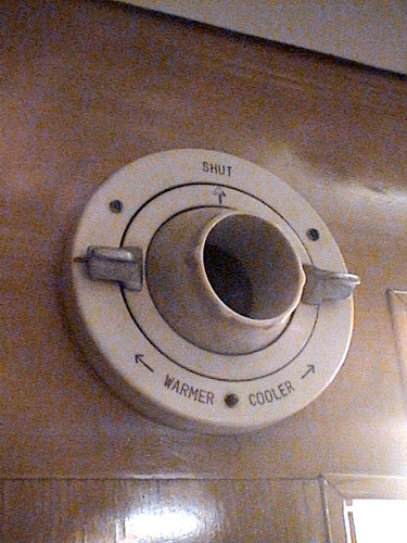 戦前の船なのに空調設備も充実。扇風機はもちろん、右の写真のようにエアコンもあってここからちゃんと冷たい風が出てきます。