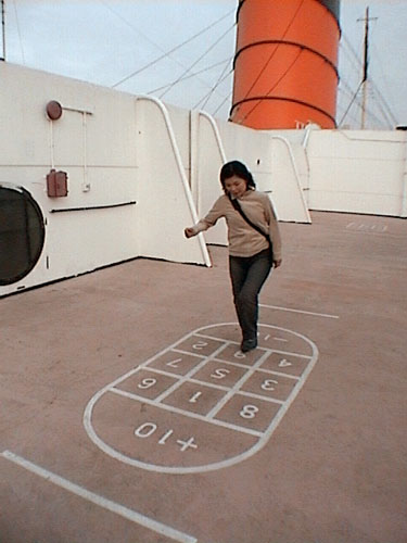 一番上の甲板で。甲板に描かれているのは航海中に乗客が楽しんだゲームのためのものでしょう。