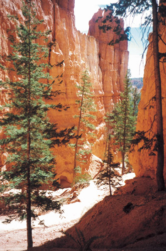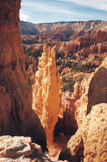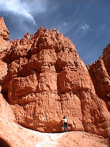 上から眺めていた尖塔群の根本をくぐり抜けるところ。上からの眺めを最初に見ているだけに、歩くだけで感動します。ほんとに。私の体と比べると、岩の大きさがわかります。